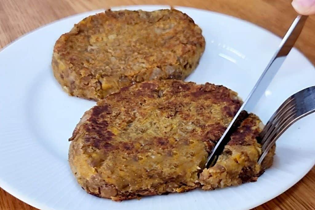 Para fazer este hambúrguer sem carne usaremos ingredientes que possivelmente você deve ter em casa. Estamos falando de lentilha cozida, cebola, alho, cenoura, azeite, farinha de aveia, sal, pimenta-do-reino, e cominho. Preparar esse hambúrguer sem carne é muito fácil! Primeiro, fritamos alho e cebola em azeite numa panela até dourar. Acrescentamos cenoura e deixamos refogar, temperando com sal, pimenta-do-reino e cominho. Adicionamos as lentilhas cozidas, amassamos enquanto refogamos e, depois de virar uma massa, apagamos o fogo e misturamos a farinha de aveia. Fritamos numa frigideira untada com azeite até dourar dos dois lados. Depois é só provar seu saborosíssimo hambúrguer sem carne!