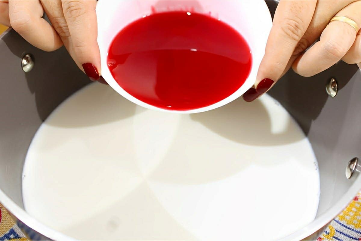 - Coloque o leite numa panela em fogo médio e deixe no fogo só até amornar. Adicione a gelatina dissolvida e misture para homogeneizar.