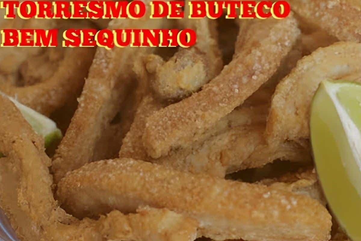 Para o torresmo de boteco, colocaremos o toucinho em uma tigela e usaremos sal e tempero misto ou pimenta-do-reino a gosto, para temperar, mexendo bem com as mãos. Em seguida, virá o segredo para deixarmos o torresmo sequinho: adicionaremos uma pitada de bicarbonato de sódio, tornando a mexer. Numa panela alta, colocaremos óleo forrando o fundo e levaremos ao fogo, acomodando todo o toicinho, sem precisarmos esperar o óleo esquentar. Acrescentaremos as folhas de louro, e o óleo estando bem quente, começando a fritar, misturaremos com uma colher de pau. Finalizaremos a receita seguindo direitinho o passo a passo. Sirva e deguste seu magnífico torresmo de boteco!
